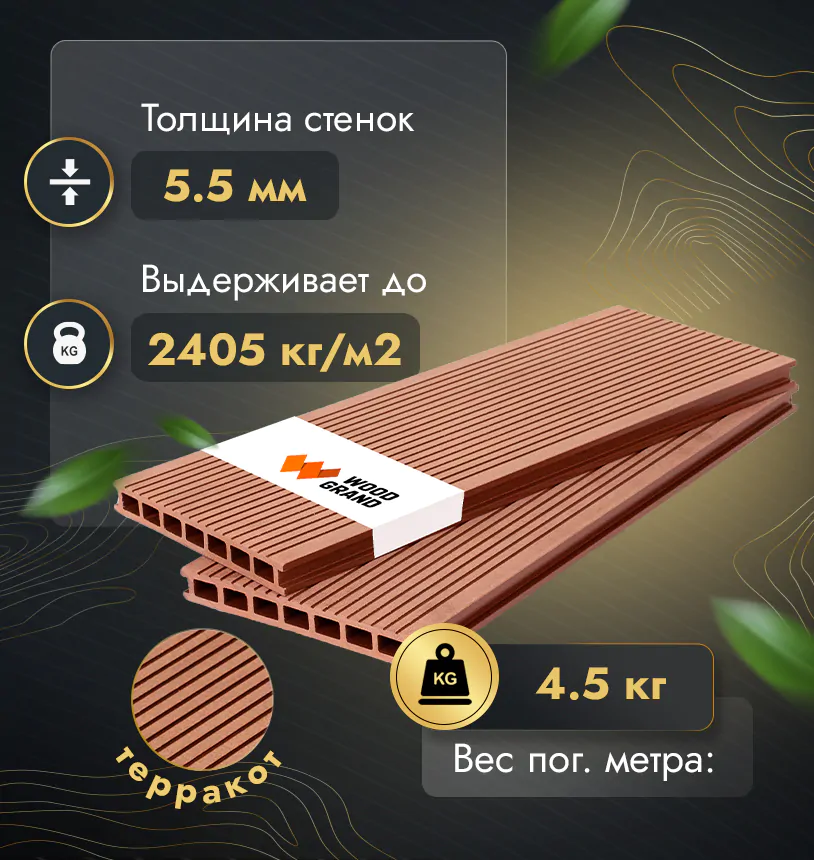 Наша террасная доска из МПК выдерживает до 3318 кг/м2, влагостойкая, не требует ухода.